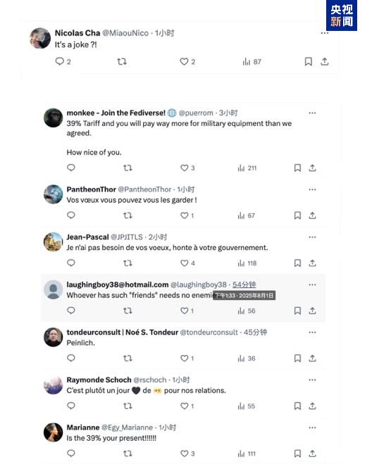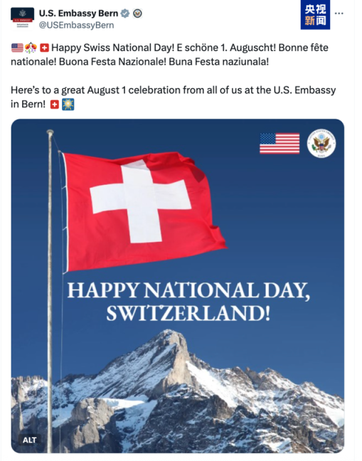 8月1日恰逢瑞士国庆节,举国欢庆。美国选择在此刻宣布“噩耗”,瞬间引爆了瑞士民众的怒火。当日,美国驻瑞士大使馆在社交媒体发布国庆祝福,却在评论区遭遇“群嘲”:“这是个玩笑吗?”“39%的关税,连向你们买的武器也要涨价。‘谢谢’祝福!”“收回你的祝福吧”“我不需要你的祝福,你的政府真丢脸”“39%的税率就是你送的‘礼’?”