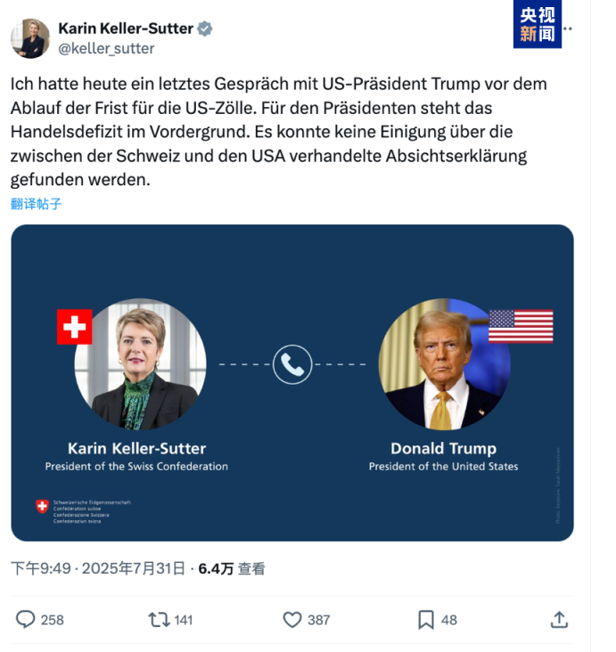 瑞士联邦主席 凯勒-祖特尔:瑞士联邦委员会感到失望,因为我们在7月初谈判达成了一项协议,并且也得到了特朗普政府内阁成员的支持。然而,显然,这些谈判代表没有得到(特朗普)总统的支持。尽管我们从美国方面收到了其他信号,来自贸易部门、商务部和财政部,这些人对我们谈判达成的内容感到满意。