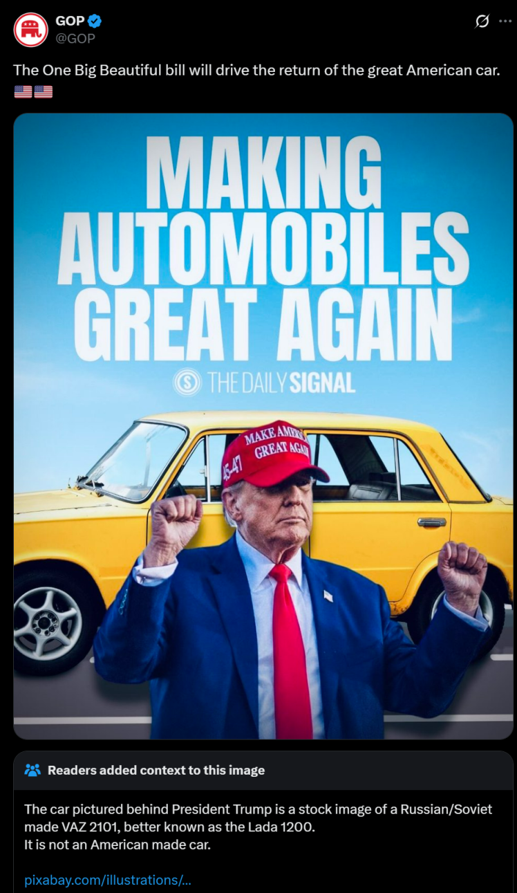 值得注意的是,在共和党上述帖文下方,X平台官方援引网友评论标注提醒称,“特朗普总统身后的汽车是俄罗斯/苏联制造的VAZ 2101的图库图片,(这款车)更广为人知的(名称)是拉达1200。它不是美国制造的汽车。”