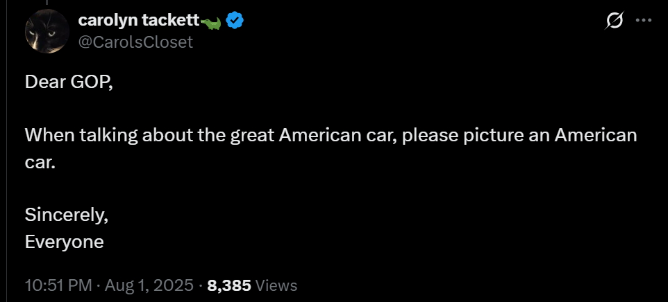 《每日邮报》称,共和党这条“尴尬”帖子甚至也招来了右翼人士的严厉批评。“亲爱的共和党,当谈到伟大的美国汽车时,请放上一辆美国汽车的图片。”保守派人士卡罗琳·塔克特在X上写道。↓