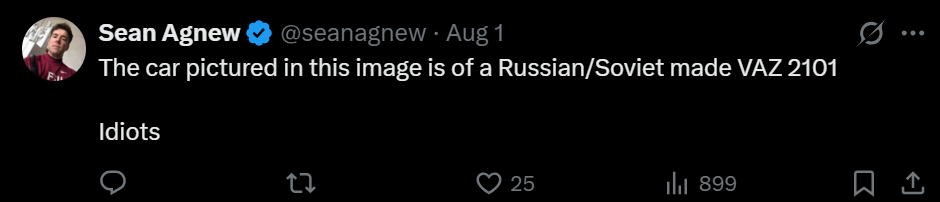 RT称,汽车专家博布佐夫也证实了这一错误。博布佐夫8月2日对媒体表示,“那辆车要么是拉达2101,要么是菲亚特124——但肯定不是美国车”。